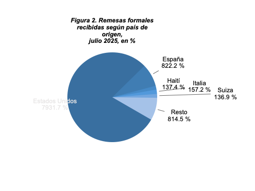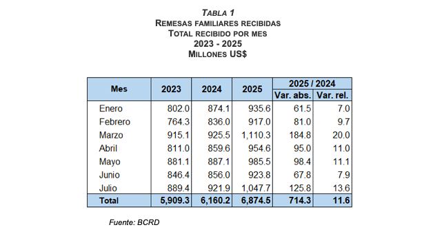 El Banco Central de la República Dominicana (BCRD) informa que, entre enero y julio de 2025, las remesas recibidas alcanzaron una cifra de US$6,874.5 millones, aumentando US$714.3 millones (11.6 %) en comparación con el mismo período del año anterior. Particularmente, el mes de julio registró un valor de remesas de US$1,047.7 millones, con un aumento de US$125.8 millones (13.6 %) comparado con el mismo mes de 2024 y US$123.9 millones (13.4 %) respecto a junio de 2025. Estos recursos enviados por la diáspora dominicana en el exterior son importantes para el desarrollo, ya que generan un efecto multiplicador en el consumo, la inversión y el financiamiento de los sectores más vulnerables del país.