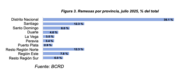 Con respecto a la distribución de las remesas recibidas por provincias, el BCRD señala que el Distrito Nacional recibió una proporción del 39.1 % durante julio, seguido por las provincias de Santiago y Santo Domingo, con un 12.3 % y 8.0 %, respectivamente. Esto indica que más de la mitad (59.4 %) de las remesas se recibe en las zonas metropolitanas del país.